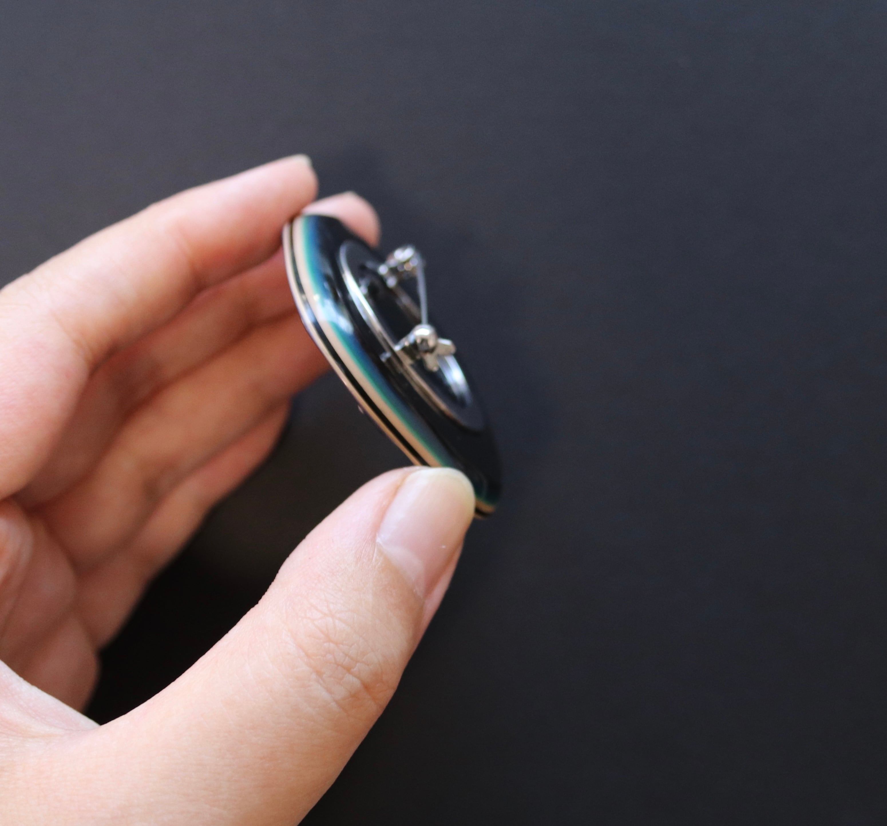 漆をガラス板に100回以上塗り重ねて約5ミリ程の厚みを作った後、漆だけを剥がしたもの(堆漆板)に彫りを施して作っています。彫りの深さによって塗り重ねた色漆のグラデーションが変わり目を楽しませてくれます。波間にアコヤ真珠を付けています。(サイズ約5×4cm)