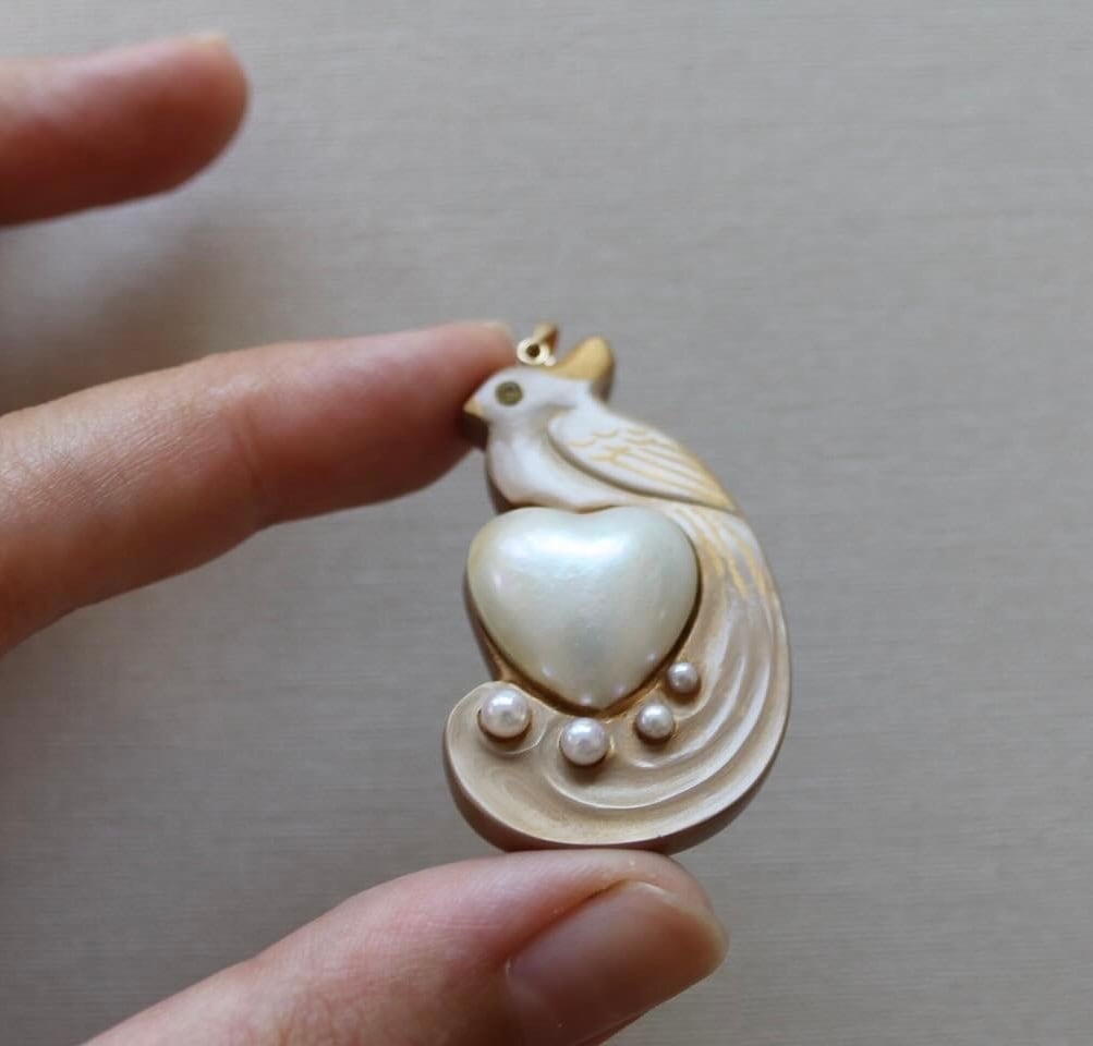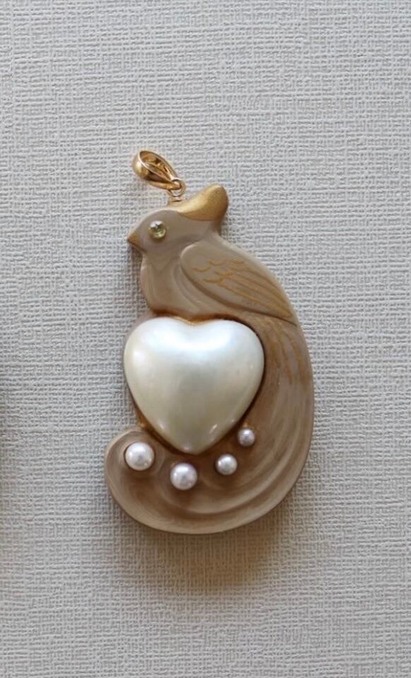 インコの目にはクリソベリルを、ハート型のマベ真珠、尾羽にはアコヤ真珠を付けています。(金具k18)(模様・純金粉)(サイズ4.5×2.5)